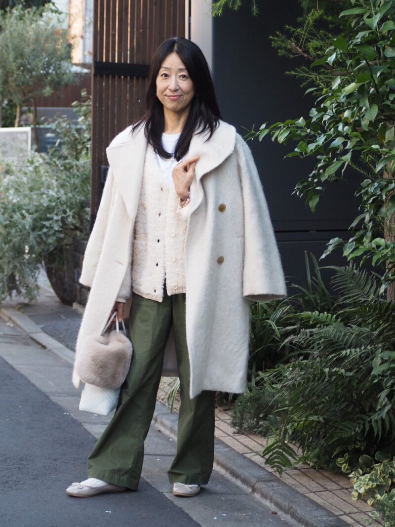 「トップスは顔映りを意識して白系のアイテムを選ぶようにしています」と、たまきさん。ホワイトを基調としたスタイリングにカーキのパンツを合わせることで、ほんの少しミリタリー要素をプラス。女性らしさを感じるすっきりとしたシルエットが品のよさを引き立てます。