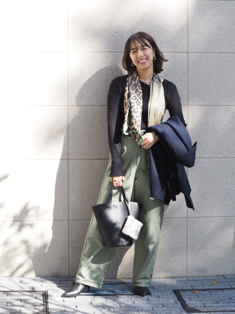軽やかに揺れるレオパード柄のスカーフが印象的な大人のカジュアルスタイル。サラッと首に着け方で、目線が縦に誘導されスタイルアップ効果もベーシックなトップスにワークテイストのワイドパンツ、足元にはヒールのあるブーツをセレクト。ほどよく抜け感がありながらも、どこか女性らしい上品さが漂います。