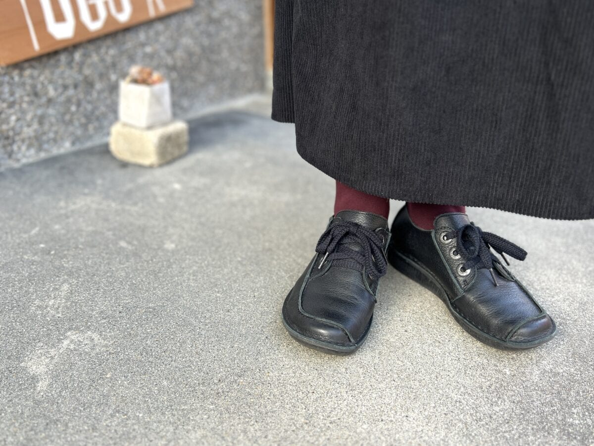 「30年ぶりにクラークスの靴を買いました。懐かしいですよね」。足元は、小豆色のタイツに、チャンキーなアイレットとクラフト感のある非対称の縫い目が愛らしい「クラークス」の定番、ファニードリーム。アユミさんの雰囲気にぴったり。