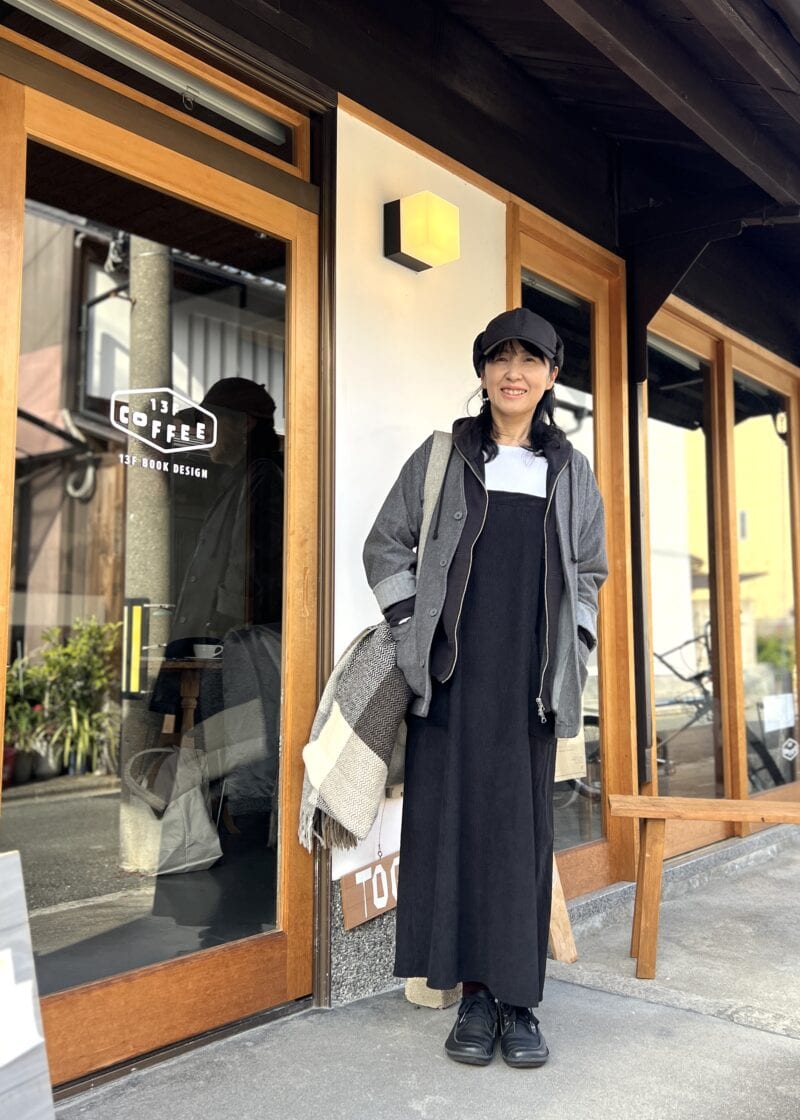 おともだち夫妻が営むカフェ「13F COFFE」で打ち合わせ中だったアユミさん。イヤーフラップ付きのあったか帽に、クリッパンの膝掛け持参で、冷え込む京都の冬を完全防寒。やわらかい起毛ヘリンボーンのノーカラージャケットは、なんと「無印良品」のメンズアイテム、ショルダーバッグは「松野屋」のスレッドライン。胸元の白のインナーが程よい抜け感。