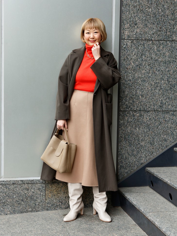 「この冬思い切って購入したコートは、どんなスタイリングにも合わせやすい優秀アイテム。一着持っていると安心感が違います」と、成田さん。深みのあるブラウンのコートにカラーニットをきかせ、大人の余裕とトレンド感をまとって。スカートやブーツは淡色でまとめることで、全体をやさしく中和。