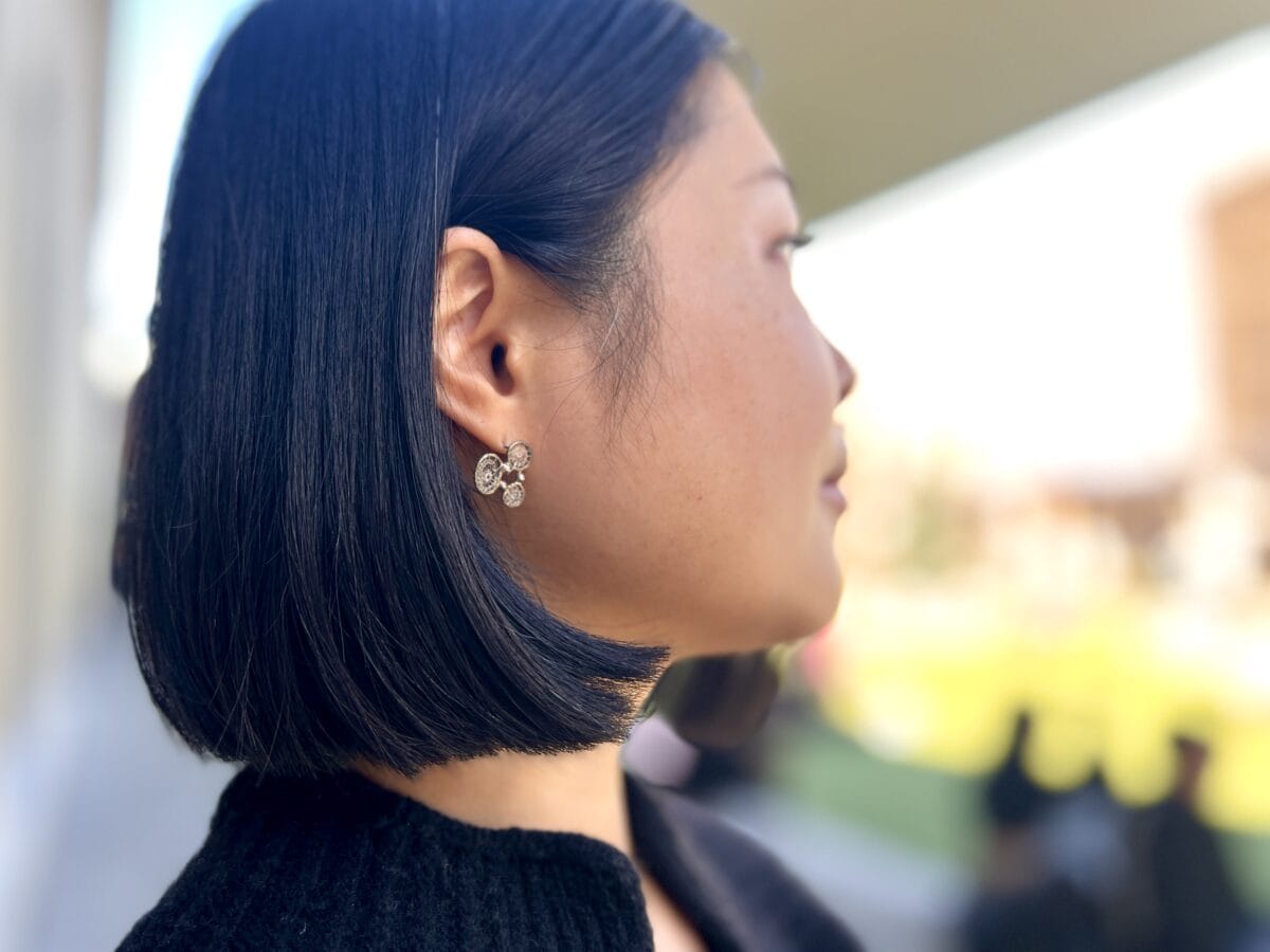 「シルバーとハンドクロシェを用いて、フルハンドメイドで作りました」。かぎ針編みの透かし編みが美しい繊細なピアスも「PIRIKATANE(ピリカータネ)」。