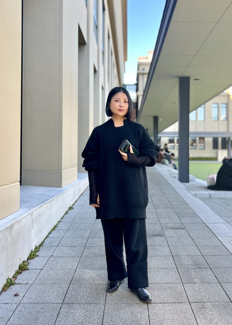 京都・木屋町通の「LE LABO KYOTO MACHIYA」で滞在制作中のなみさんをスナップ。20度近くまで気温の上がった小春日和の1日は、アウターなしでも全然平気。「PIRIKATANE(ピリカータネ)」は、国内生産にこだわった、世界観のあるニットブランド。「今日は、ピュアシルクのインナーと、メリノウールのセットアップを着用しています」。凛としたなみさんの立ち姿に、オールブラックの装いがお似合いです。