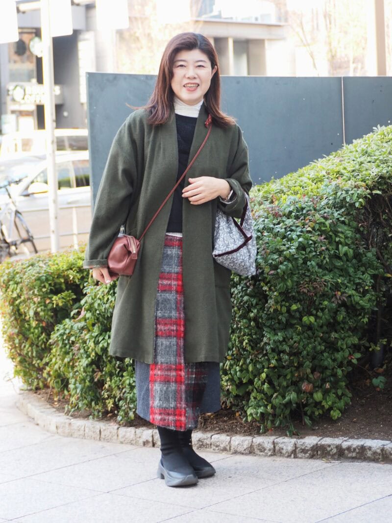 カーキのアウターに赤をちりばめた、ホリデーシーズンにふさわしい大人カジュアル。トレンドのチェック柄スカートがコーディネートの主役に。「カラーアイテムを取り入れるのが好きで、今日は赤をポイントに使ってみました。占いを参考にすることもあります!」