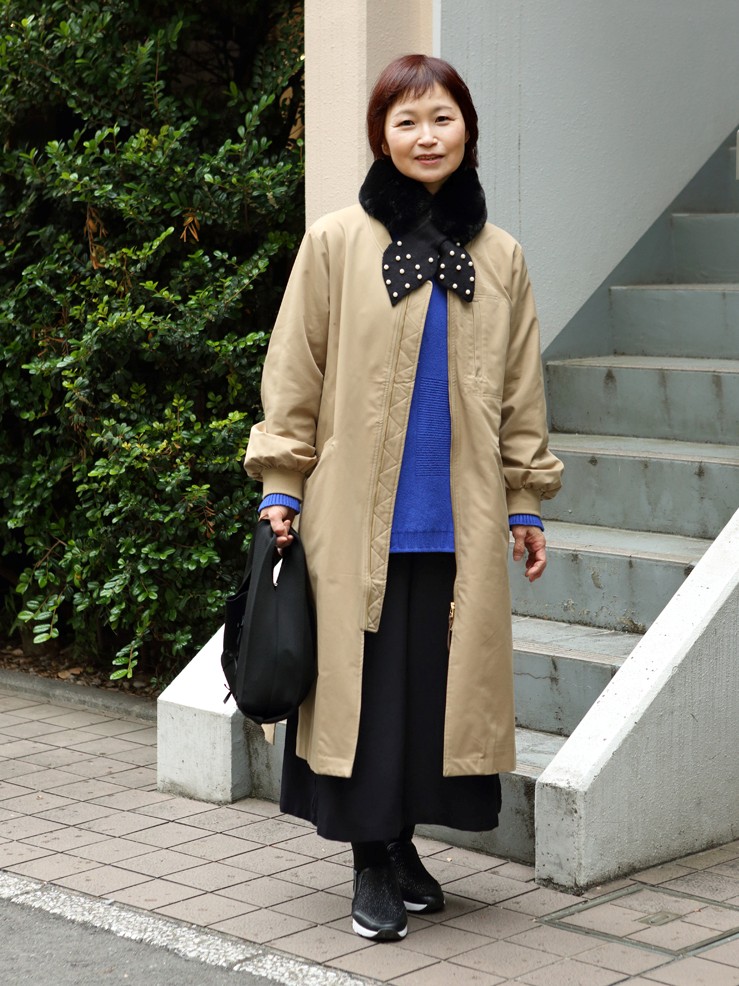 黒とベージュ、ベーシックカラーでまとめたシンプルな装い。小物も黒で統一することで、鮮やかなブルーのニットがより一層際立ちます。「小柄なので、洋服に着られないようにバランスを意識しています」。ストンと落ちるシルエットが◎。