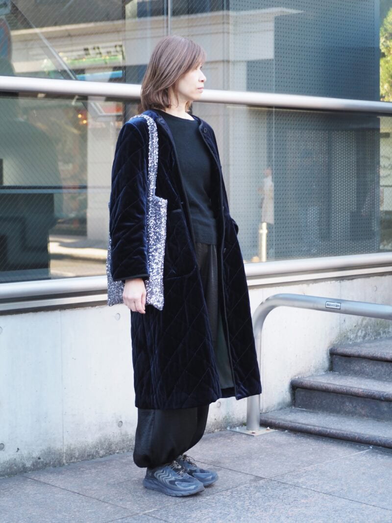 黒を基調としたシックな装いに、深みのあるベロア素材のコートをオン。上品な艶感とキルティングが立体感を生み、印象に残る着こなしに。落ち感のある「ザラ」のワイドパンツは、裾にかけてのボリューム感が◎。シンプルながら、鮮度の高いスタイリングに仕上がっています。
