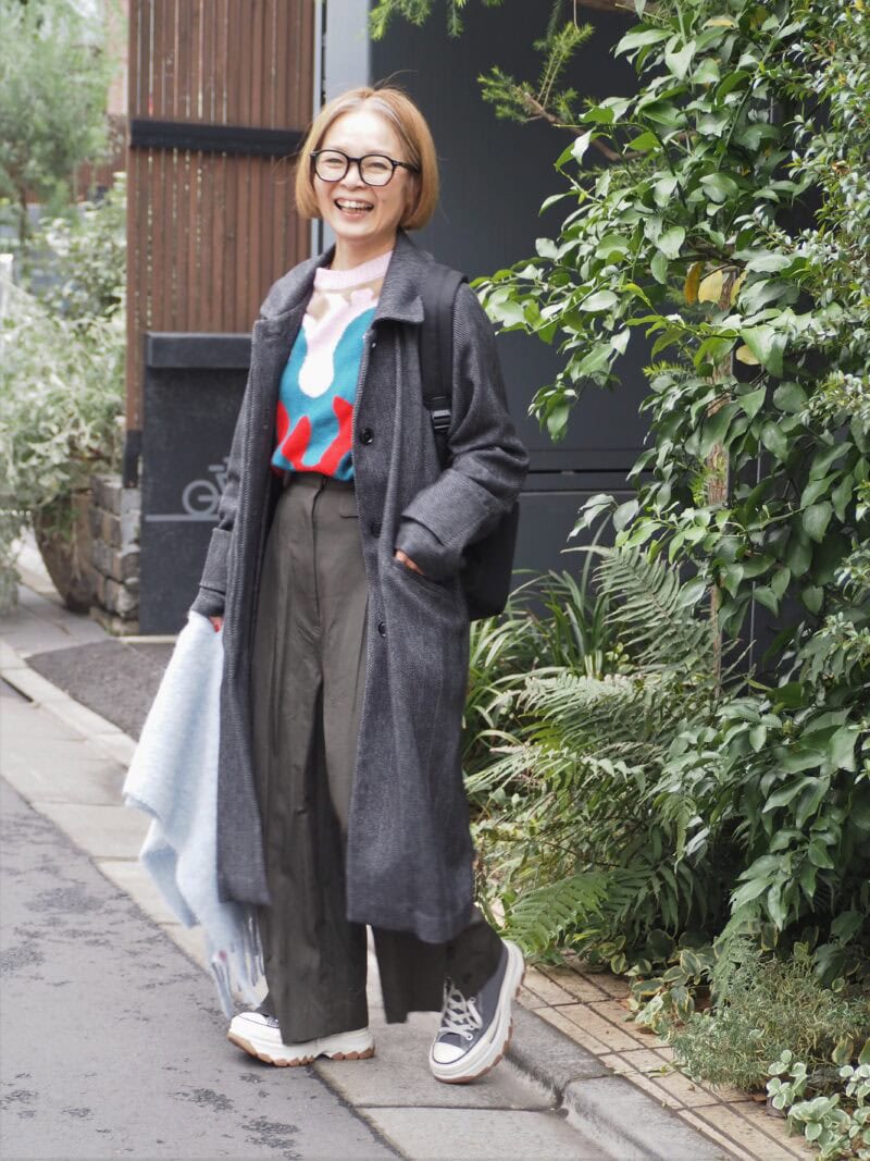 「ピンクのベースに赤とブルーのあしらいが可愛くて気に入っています」と、よねもりさん。コーディネートの主役に選んだのは、遊び心のあるカラーニット。コートとボトムの色を押さえることで、メリハリのある着こなしに。ニットの色を拾った「マルニ」のストールは冬のおしゃれに欠かせないアイテム。