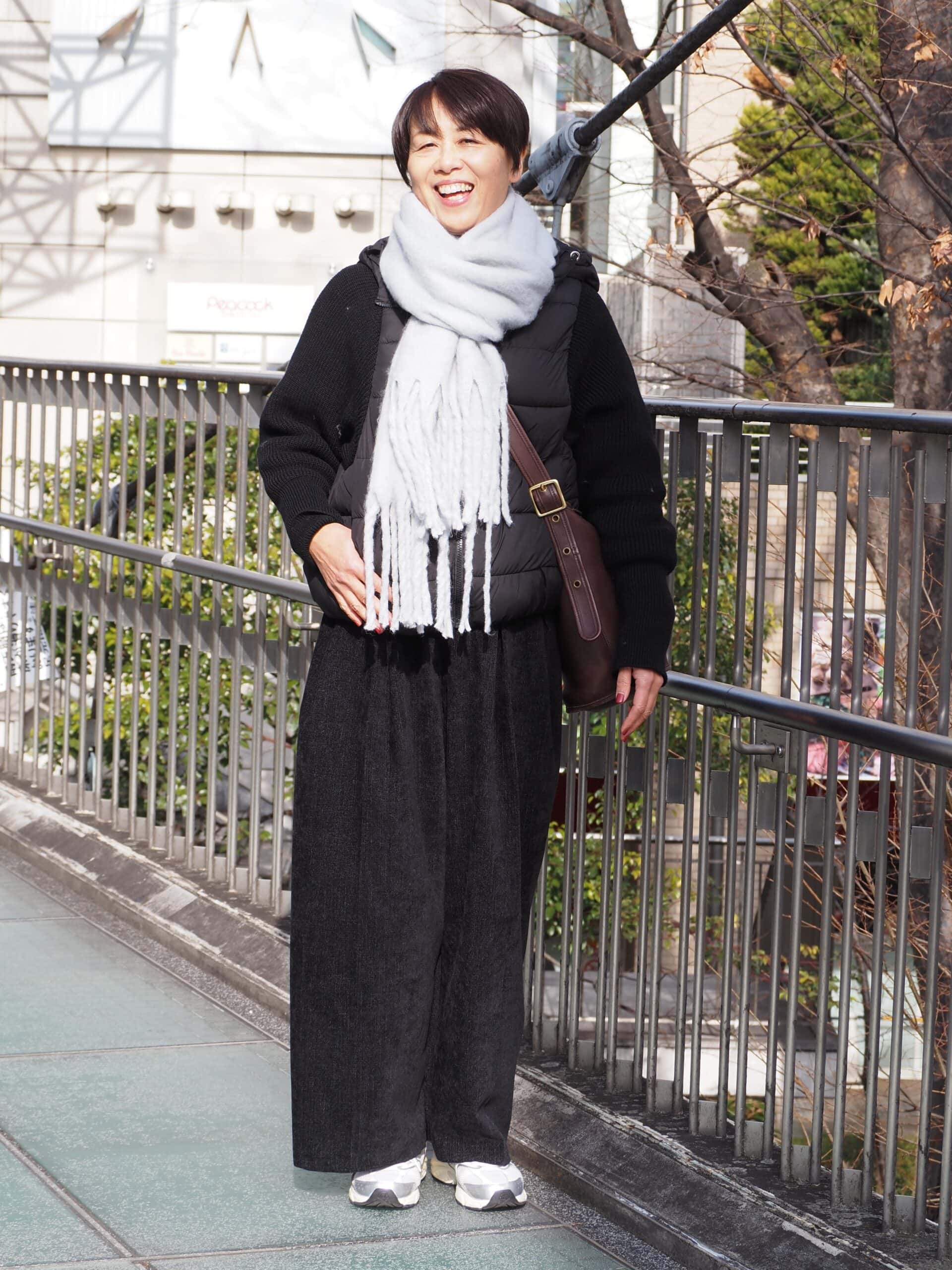 アウターとパンツは、感度の高い大人世代から注目を集めるアパレルブランド「プラスオトハ」のもの。ニットとダウンの異素材切り替えがおしゃれなアウターは、今年の冬の定番に。「ベーシックな色を使うことが多いので、ノベルティでいただいたブルーグレーのストールを挿し色として選びました」