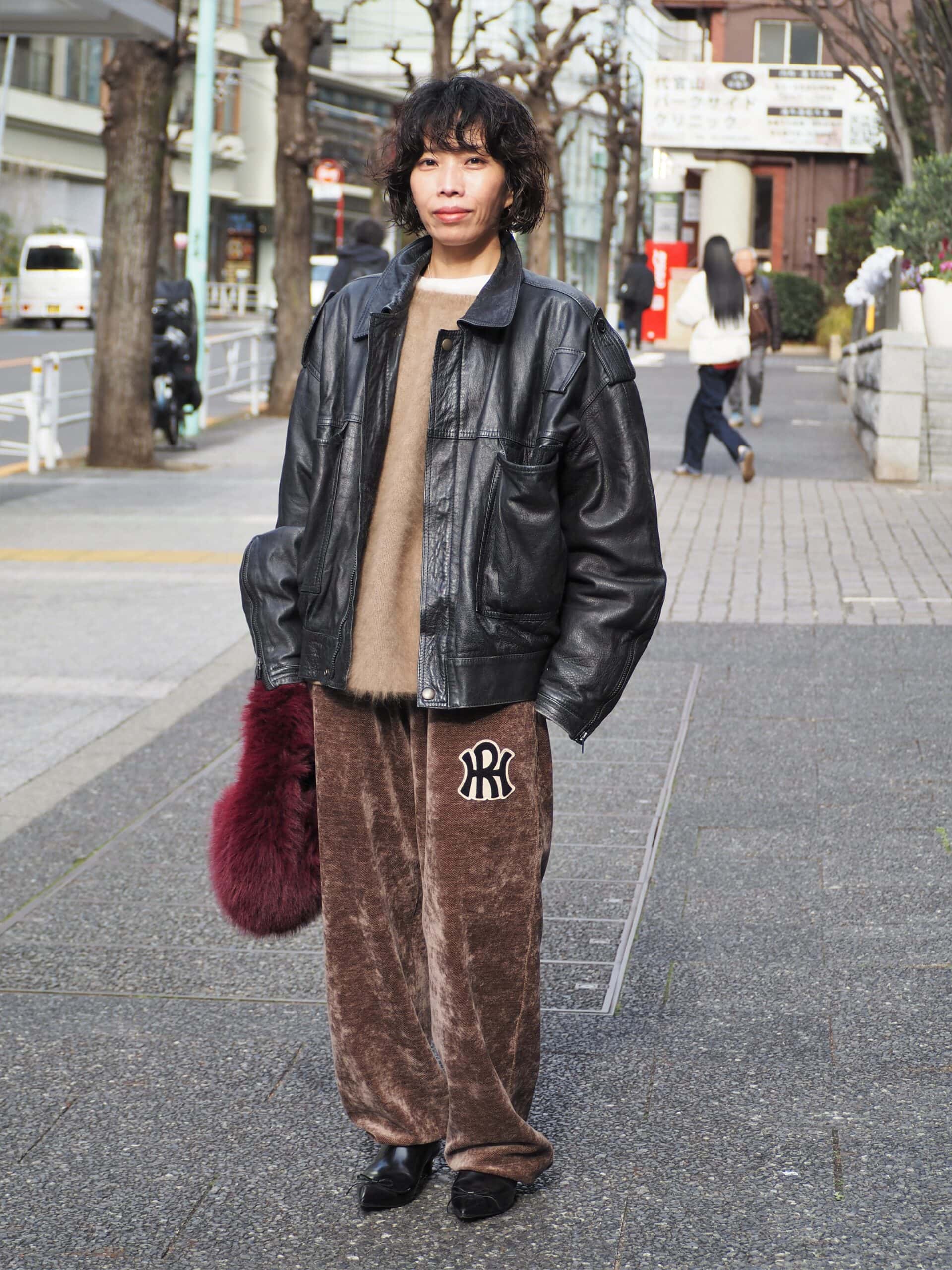 オーバーサイズのレザージャケットにスウェットパンツを合わせたメンズライクなスタイル。「メンズアイテムのデザインが好みです。このアウターは昨年の秋に購入しました」。ハードな印象になりがちなレザージャケットも、色選びと素材感でやわらかく中和。リラックス感のあるシルエットも◎。