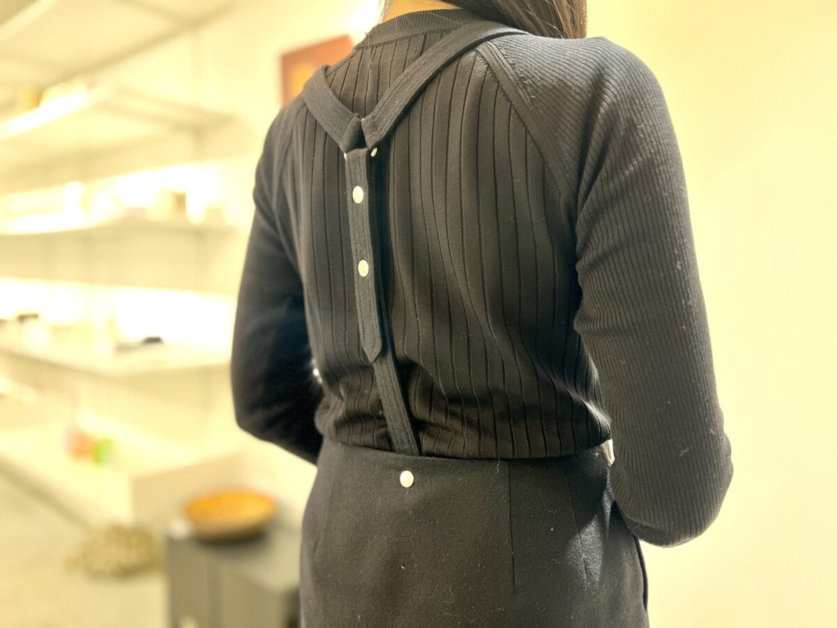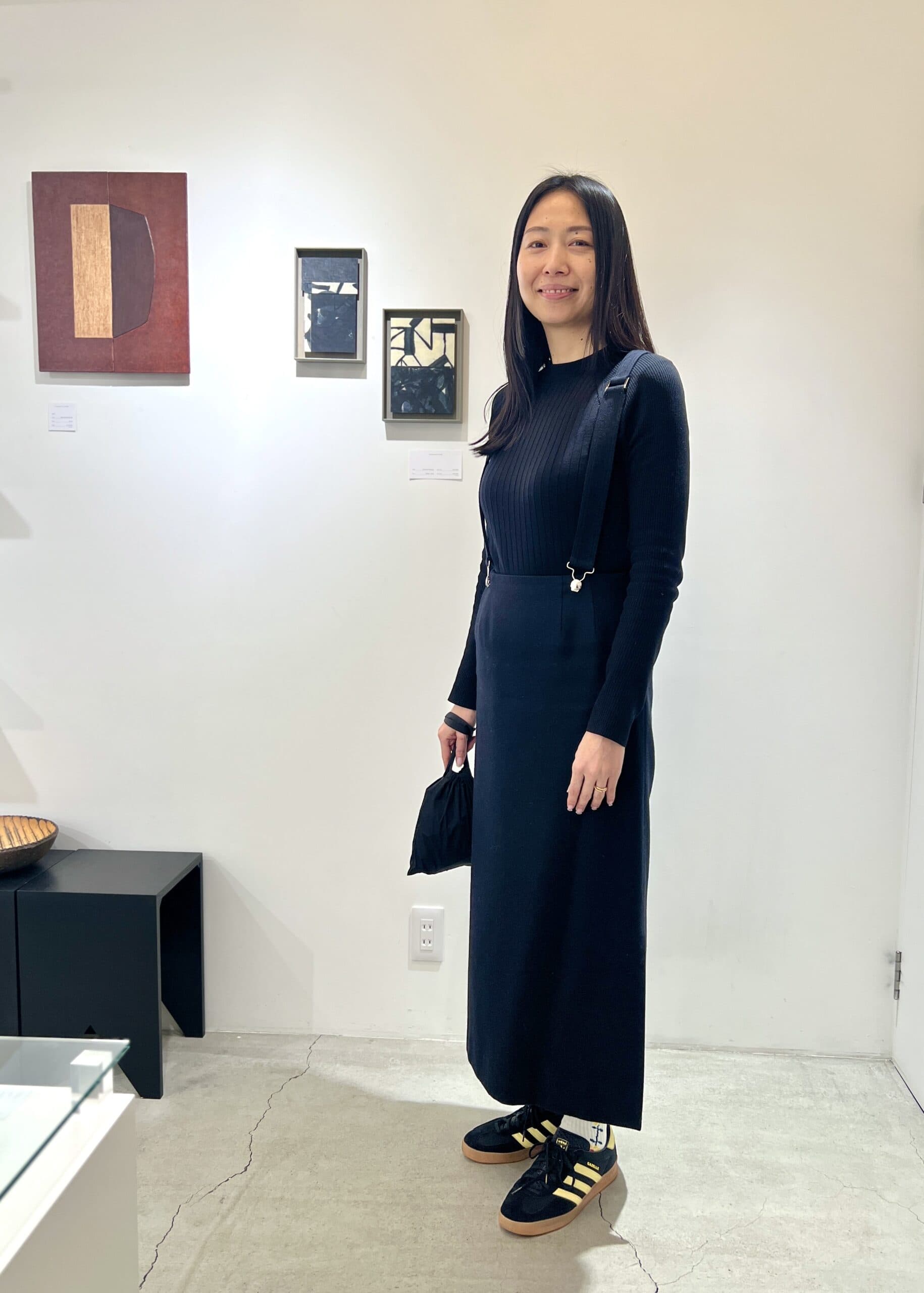 京都のギャラリーショップ「Community Store TO SEE」で行われていたクリエイターの蚤の市で、編集者の莉衣さんをスナップ!この日はお気に入りのブランド「THE RERACS(ザ・リラクス)」のサスペンダースカートが主役。「シンプルなスタイルが好きなのですが、コンサバに見えすぎないように、シルエットやデザインに気をつけています」。モードなワントーンコーデと思いきや、足元を「アディダス」のガゼルと白ソックスでスポーティに外して軽快に。