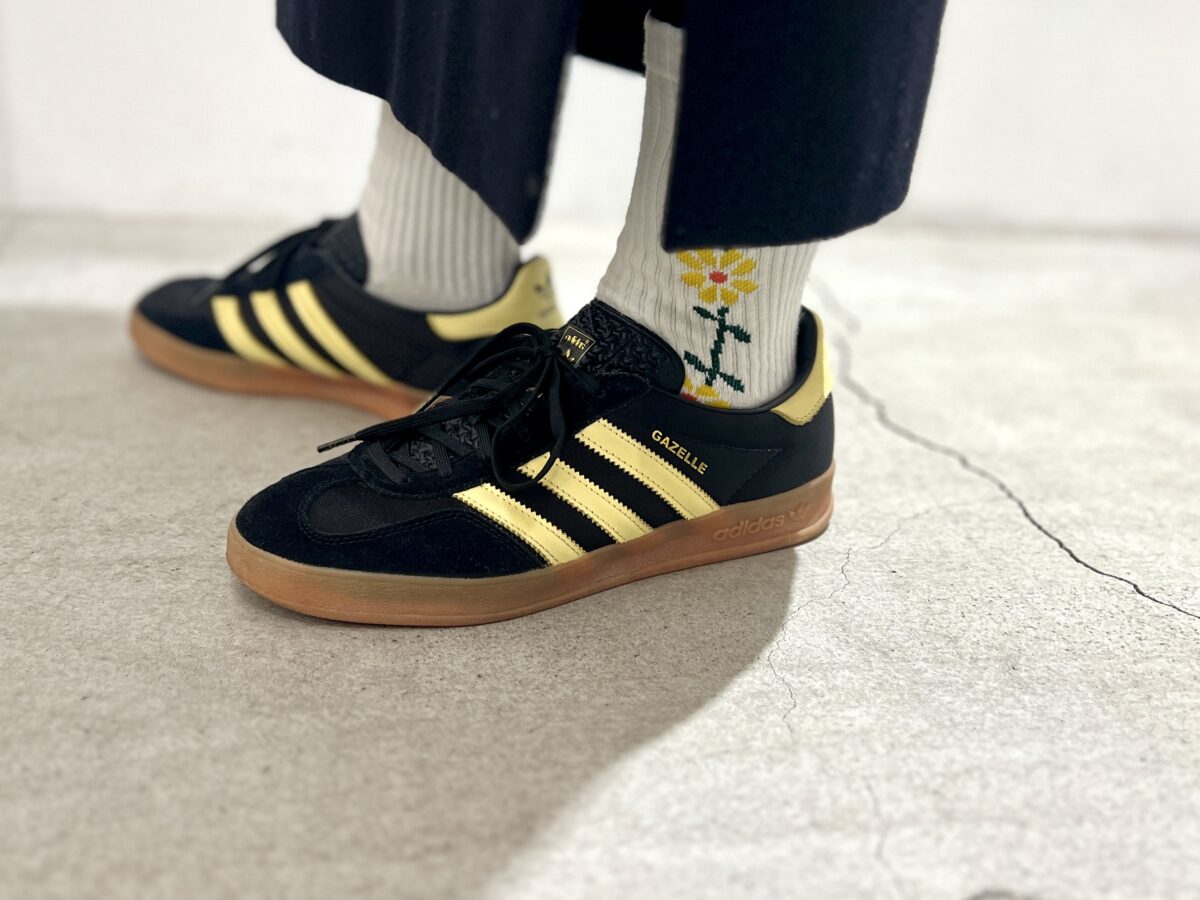くるぶしには、子供のお絵かきのような花の刺繍がかわいい白ソックスがちらり。日本製らしい質実剛健さを誇る「ROSTERSOX(ロスターソックス)」。「シンプルな着こなしが好きなんですが、今日はソックスで遊んでみました」。