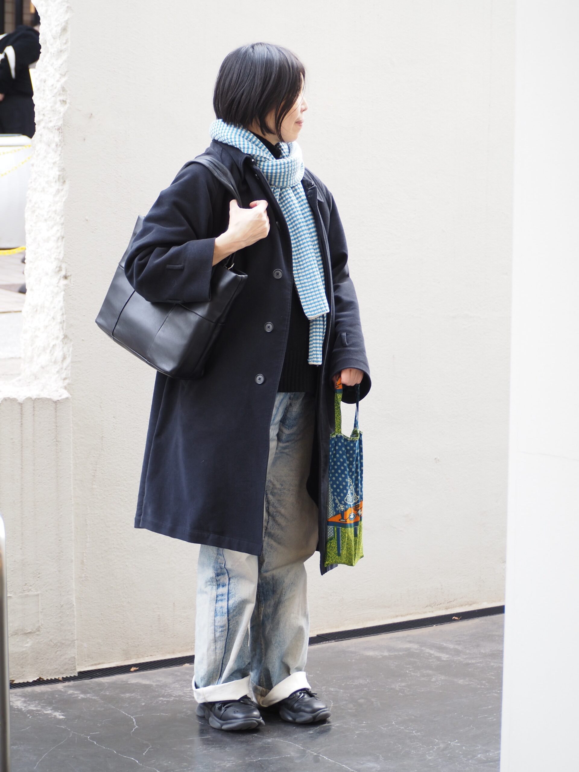 イギリスのアパレルブランド「コービーズ」のウールコートは、軽量であたたか。トレンドに左右されない名品です。この日は淡いブルーのデニムとブルーのマフラー、同系色でそろえて統一感のある着こなしに。薄手で締め付けの少ないデニムは、クラッシュ加工と思いきや、なんとダメージプリント。「基本はシンプルが好きですが、ほんのり遊び心を感じるものに心が動きます」