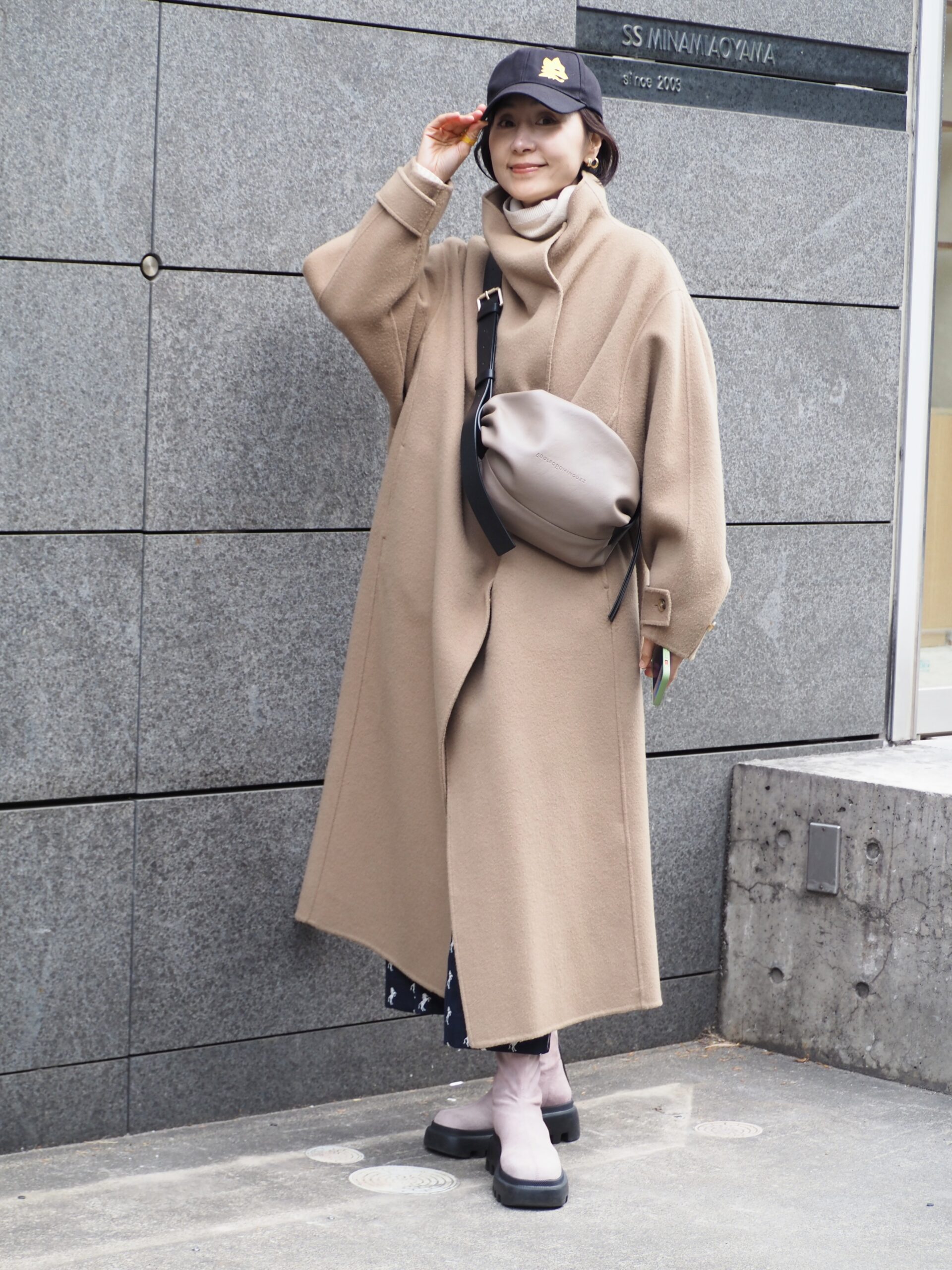 普段はイタリア在住で、この日たまたま日本に来ていたMikiさんをキャッチ! しなやかなベージュのロングコートをまとったエレガントな装いがお似合い。首元に立体感のあるデザインで、ストールいらずでも顔まわりがさみしく見えないのが◎。小物はキャャップやボディバッグを合わせて、ほどよいカジュアル感をプラス。