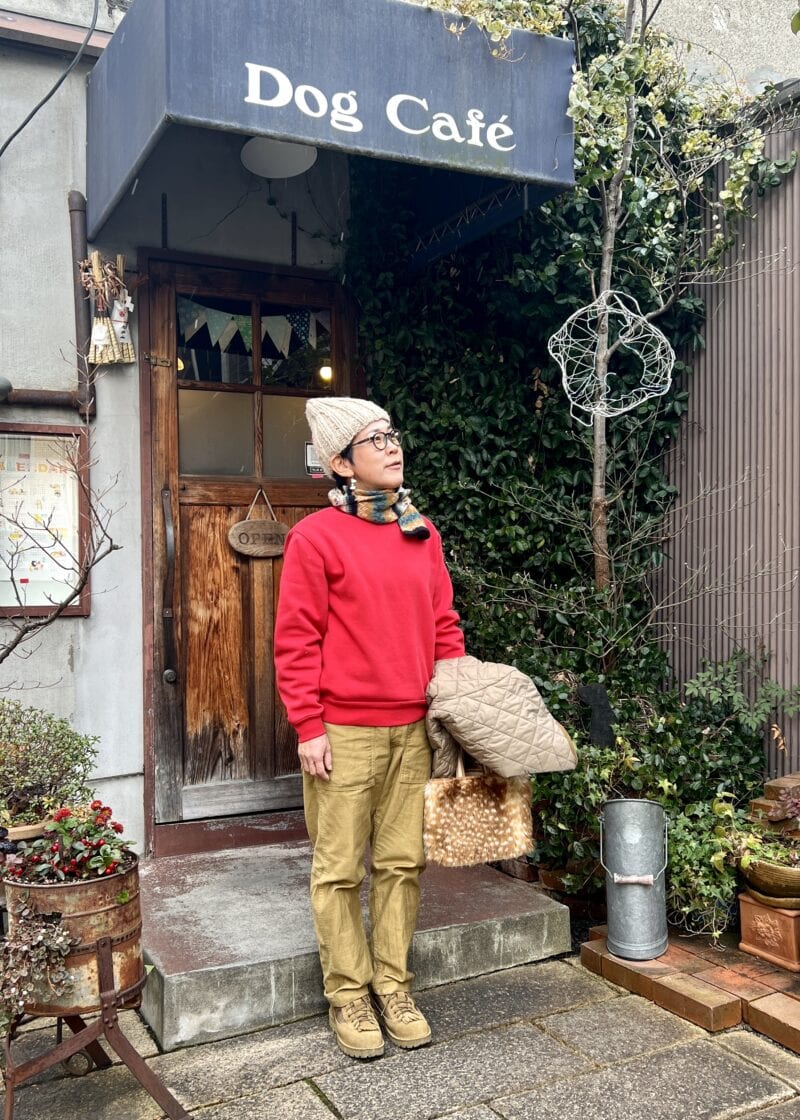 背中に「LONG TRACK FOODS(ロングトラックフーズ)」のロゴをプリントしたスタンダードな赤スウェット。ロングトラックフーズは、おしゃれと食に敏感な3人が共同運営する鎌倉の店。TOKUさんが京都で作る犬用クッキーも購入できる。「デザインがいいのはもちろん、裏起毛なのでめちゃくちゃ暖かいんです。寒さ厳しい季節にとても助かってます」。