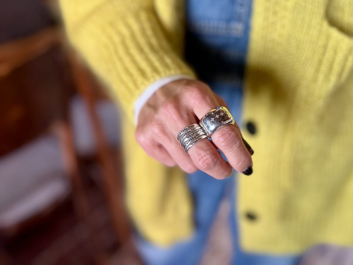 視る、聴く、触る、嗅ぐ、味わう。人間の五感が刻まれたシルバーリングは、「SERGE THORAVAL(セルジュ トラバル)」の5連リング。「アクセサリーは、シルバーがずっと好きで愛用しています」。ラフなデニムスタイルも、アクセサリー使いでグッと艶感アップ!
