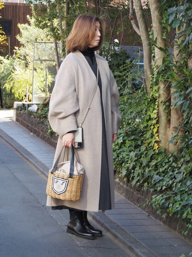 表参道のギャラリーに向かう途中のミュゲさんを直撃。色数をおさえたミニマルなスタイルに、かごバッグでさりげない遊び心をプラス。こうすることで、冬の装いがぐっと軽やかに。コートは中にニットを合わせても着膨れしない絶妙なボリューム袖が◎。「ユニクロ」のタートルネックと「リゼッタ」のワンピースはブラック×グレーでシックにまとめて。