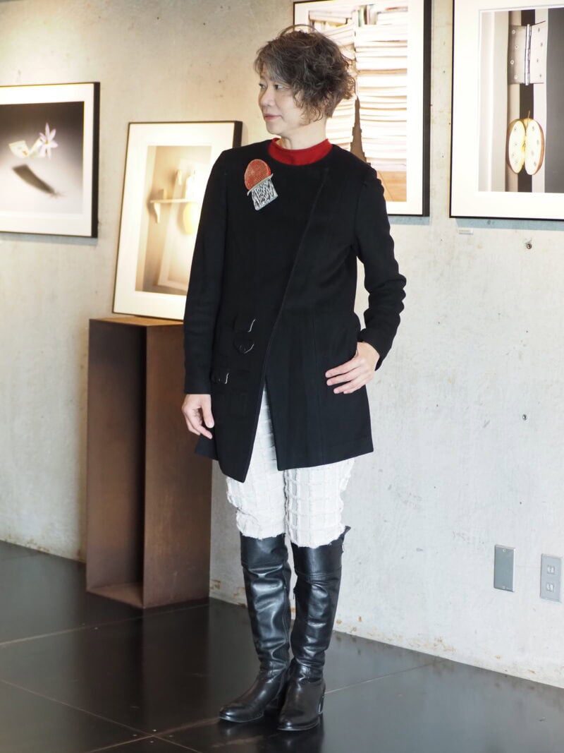 年齢に縛られず、着たいものを着ることを信条にファッションを楽しむ山本さん。この日はモノトーンコーディネートに赤をきかせたシックな装い。ギャラリストの経験から培った審美眼が冴えわたる、鮮度の高いアイテム選びがステキ。「『フリーマンB』のカシミヤトップスは、冬のおしゃれに欠かせないアイテムです。ものづくりへの愛が伝わるものに惹かれます」
