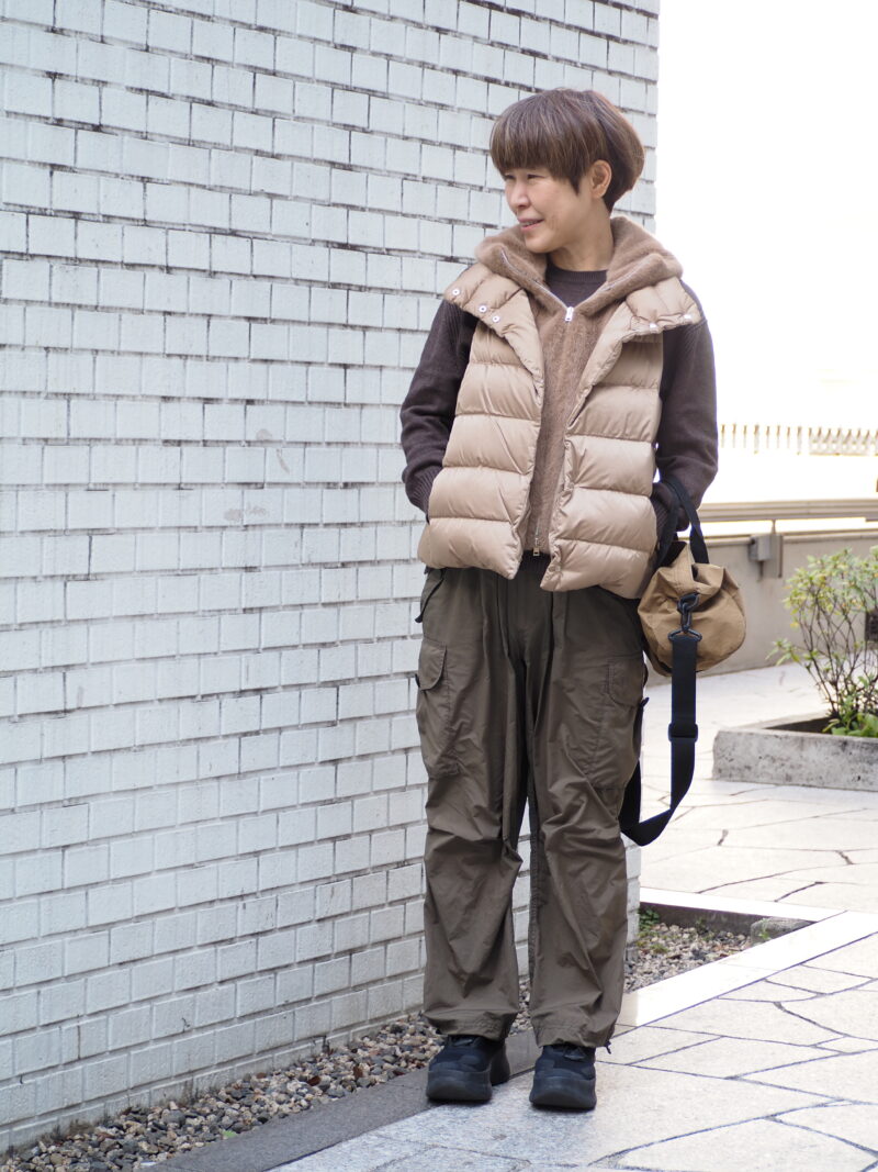 「ドゥロワー」のニットに重ねた「ヘルノ」のダウンベストは、ようこさんのお気に入り。ダウンとボアの異素材切り替えが、奥行きのあるスタイリングを叶えてくれるそう。この日はカーキのカーゴパンツでミリタリー要素をプラス。軽快なアクティブコーディネートの完成です。