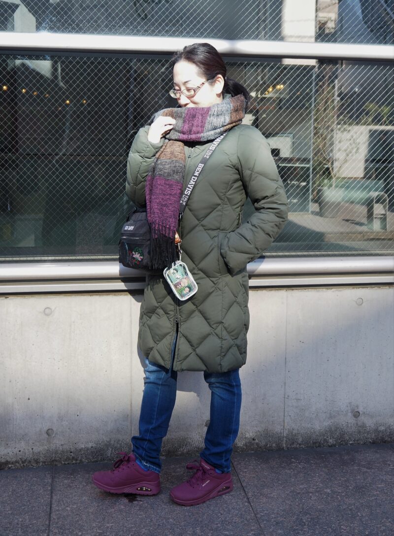 足元は、長時間歩いても疲れにくい「スケッチャーズ」のスニーカーをチョイス。マフラーとのカラーリンクが目をひく小物使いがポイント。