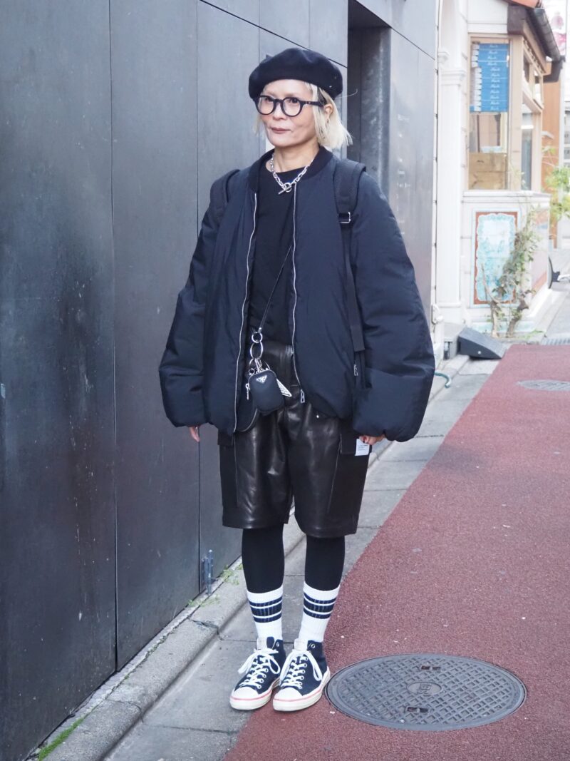 ご主人と共用のダウンジャケットをゆるっと着こなし、ボトムは武骨なレザーパンツをチョイス。黒をベースにしながらも、素材感と小物使いで動きのあるスタイリングに。「これからレディ・ガガのライブに行くので、動きやすさを重視して足元はスニーカーにしました」。モードな雰囲気をまとったアクティブスタイルがお似合いです。