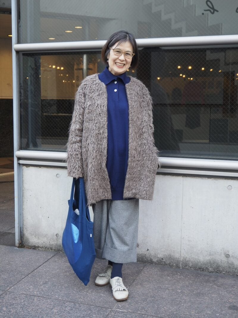 毛足の長い「saqui」のコートは10年、90年代に人気を博した「ロメオ・ジリ」のニットは約30年。お気に入りを大事にしながらおしゃれを楽しむ姿勢がステキです。「好きなものを身につけると気持ちも明るくなりますね。基本的にはベーシックカラーでまとめつつ、カラーアイテムで色をプラスすることも」