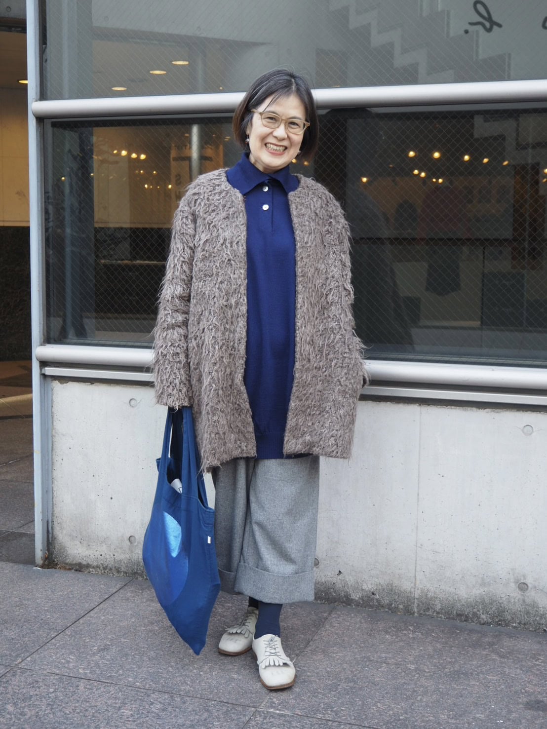 【スナップ】さえわたるブルーのニットを指し色に! 50代の上品冬コーデ in表参道