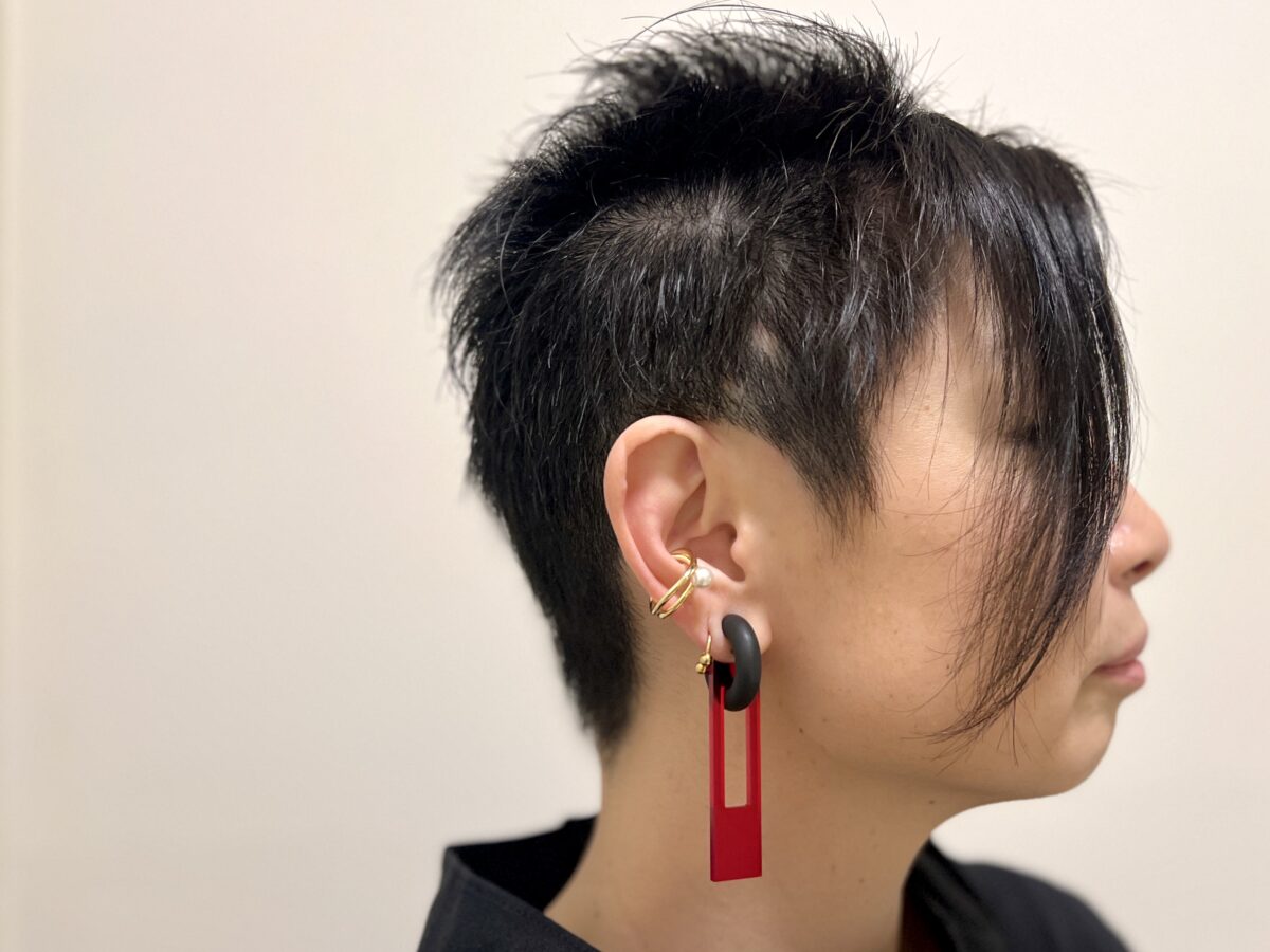 ぱっと目をひく大ぶりで個性的なイヤリングは「アクリリック」。パールが春らしいイヤーカフは、京都の「ririchuchu(リリチュチュ)」。「ベリーショートなので、イヤーカフやピアスは何個でも重ね付けしたいくらい好きです」。