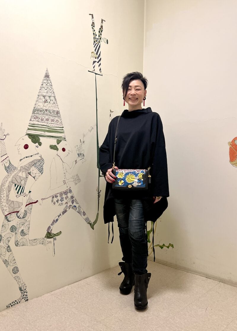 ベリーショートに変形シルエットのトップスをクールになびかせて現れたのは、テキスタイルデザイナー・アーティストの谷川幸さん。「好きなものは変わらないけれど、大人世代になって、ハイブランドのものより作家さんのものや思い出のあるもの、自分にとってのお守り的なアイテムを身につけることが多くなりましたね」。