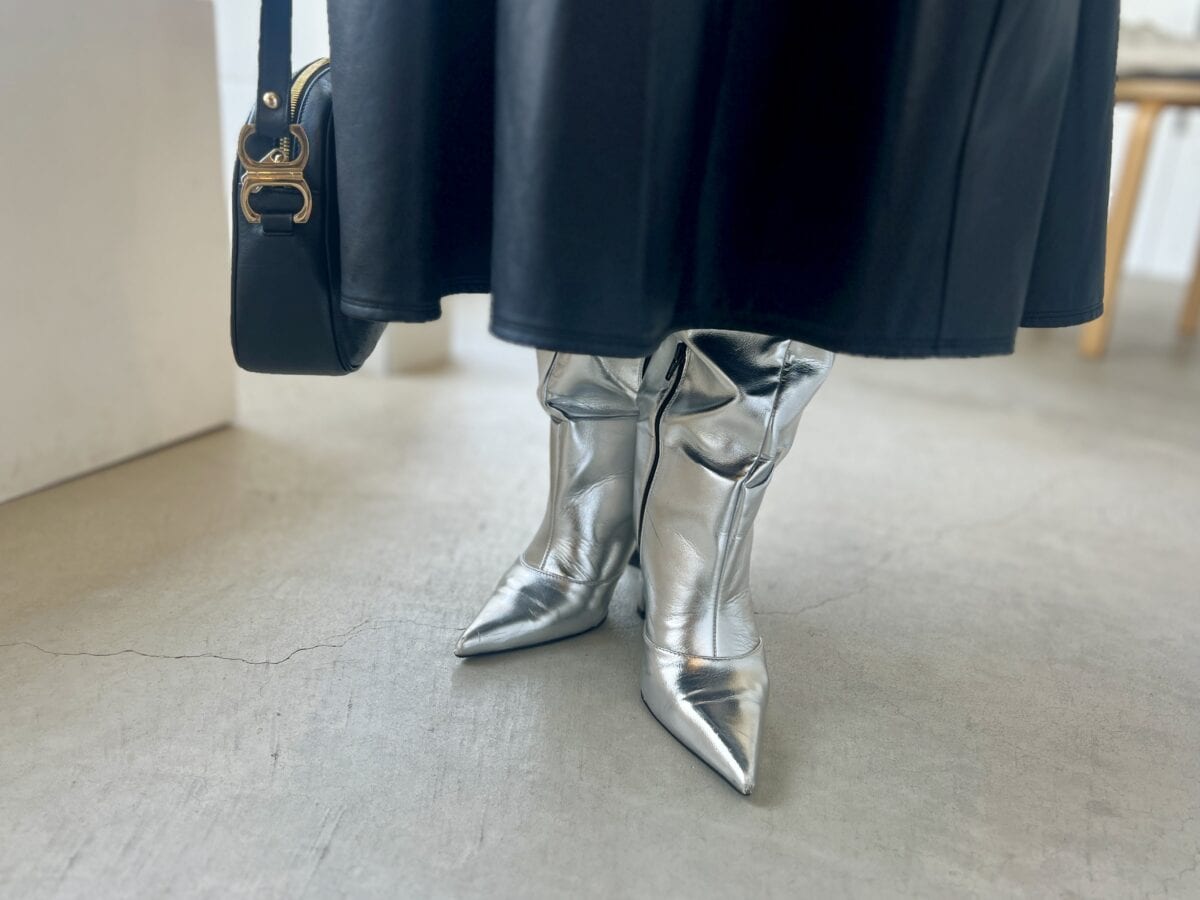 個性際だつシルバーのロングブーツが小気味よいアクセント。「普段はスニーカーが多いので、ヒールのある靴を履くと、背筋が伸びる感じがいいですよね」。
