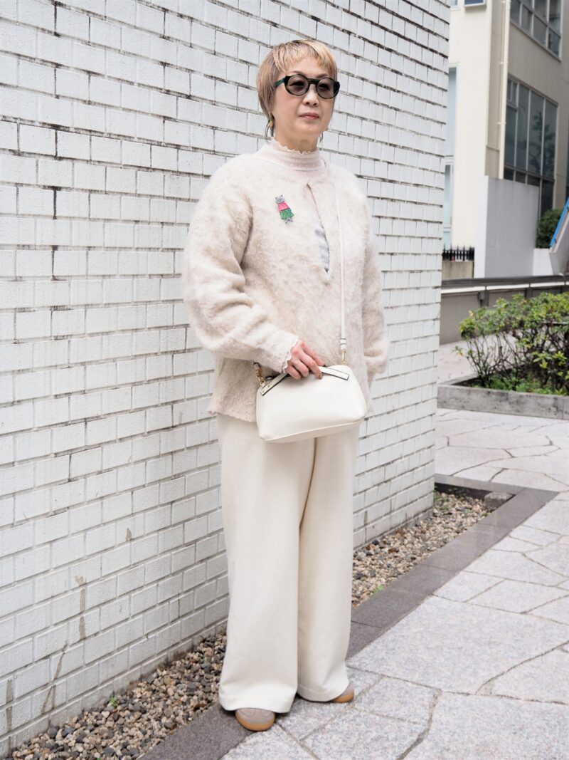 全身を淡色でまとめながらも、素材の違いで奥行きを出した洗練スタイル。ウールのニットからちらりとのぞくチュールトップスで、まもなく訪れる春のさわやかな空気感を演出。明るいショートヘアとの相性も抜群です。