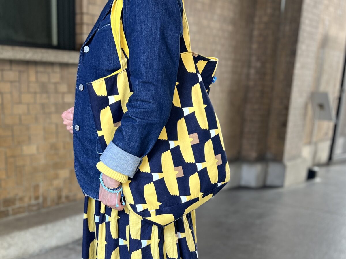 「歳を重ねてから、きれいな色や楽しい服を着るようになりました」というMariさん。ミモザの季節、春の到来を告げるような、軽快で鮮やかなイエローが街に映えます。「スカート、バッグ、アクセサリーと、地元・京都でつくられているアイテムを重ねてみました」という、ちょっとした遊び心も楽しいですね。