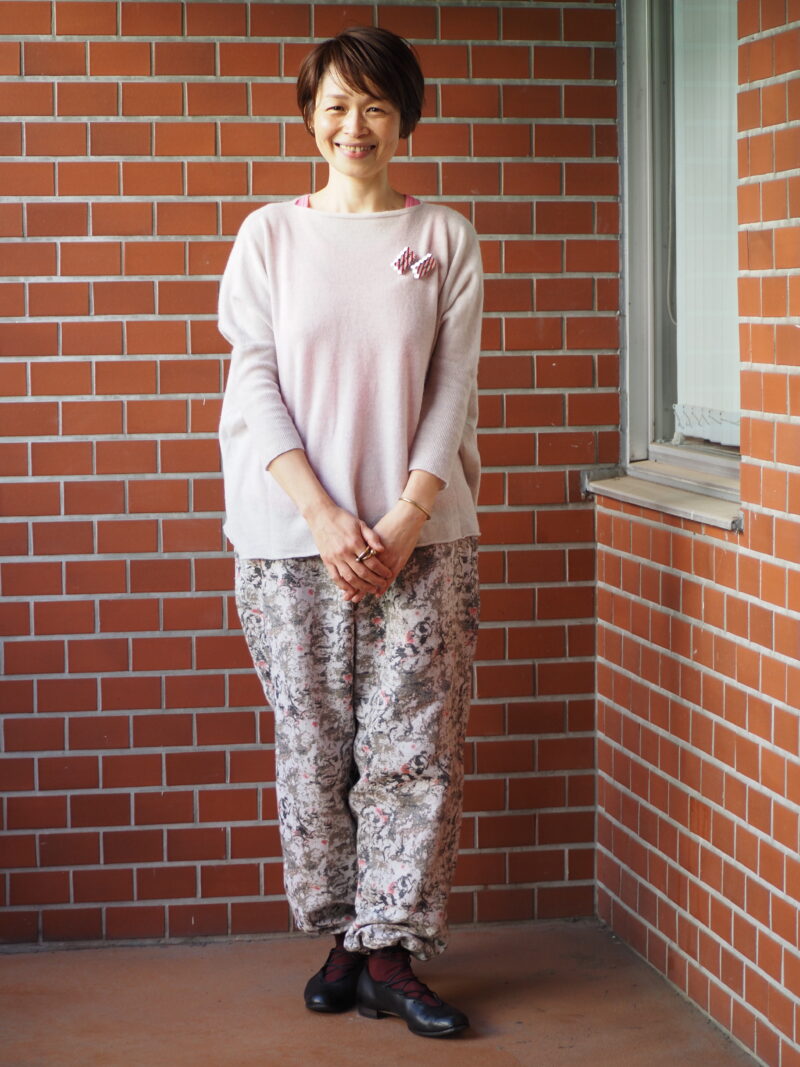 春らしい色と柄を取り入れたカジュアルな装いで、表参道のギャラリーに立つ佐藤さん。花柄パンツから色を拾ったピンクのニットが顔まわりをパッと華やかに。ゆるやかなシルエットのものを選ぶことで、適度なリラックス感を演出。
