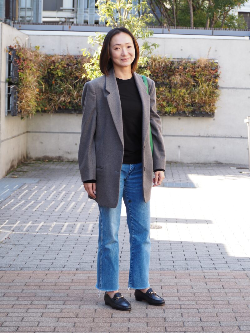 ジャケット、レザーバッグ、ローファーでクールにまとめながら、ユーズド感のあるデニムでほどよくラフな印象に。
