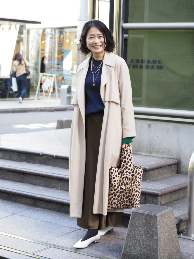 とろみのあるトレンチコートとサテンのロングスカートでエレガントにまとめつつ、ヒョウ柄バッグでアクセントを。「『ユニクロ』のサテンスカートはお値段以上。毎年のように色違いが発売されるので、チェックしています」。アウターの袖からさりげなくグリーンをきかせて、奥行きのある着こなしに。
