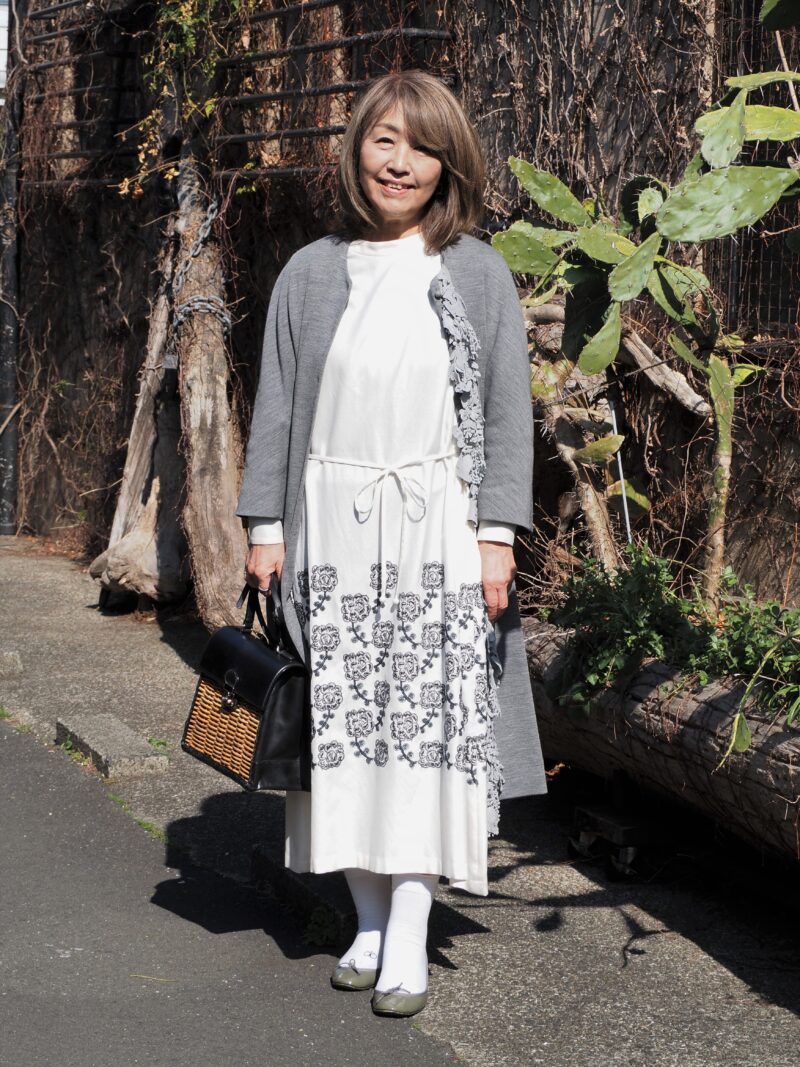 よく晴れた春の日、ご主人と代官山でお買い物中のKyokoさんを直撃。爽やかなホワイトワンピース、さらっと羽織ったロングーディガンはいずれも「ミナ ペルホネン」のもの。どちらも丁寧に繕われた刺しゅうが印象的で、絵になるアイテム。「かれこれ10年近くこちらのブランドのファンなんです。毎シーズン、今回はどんなステキなものに出合えるかなと、楽しみにしています」