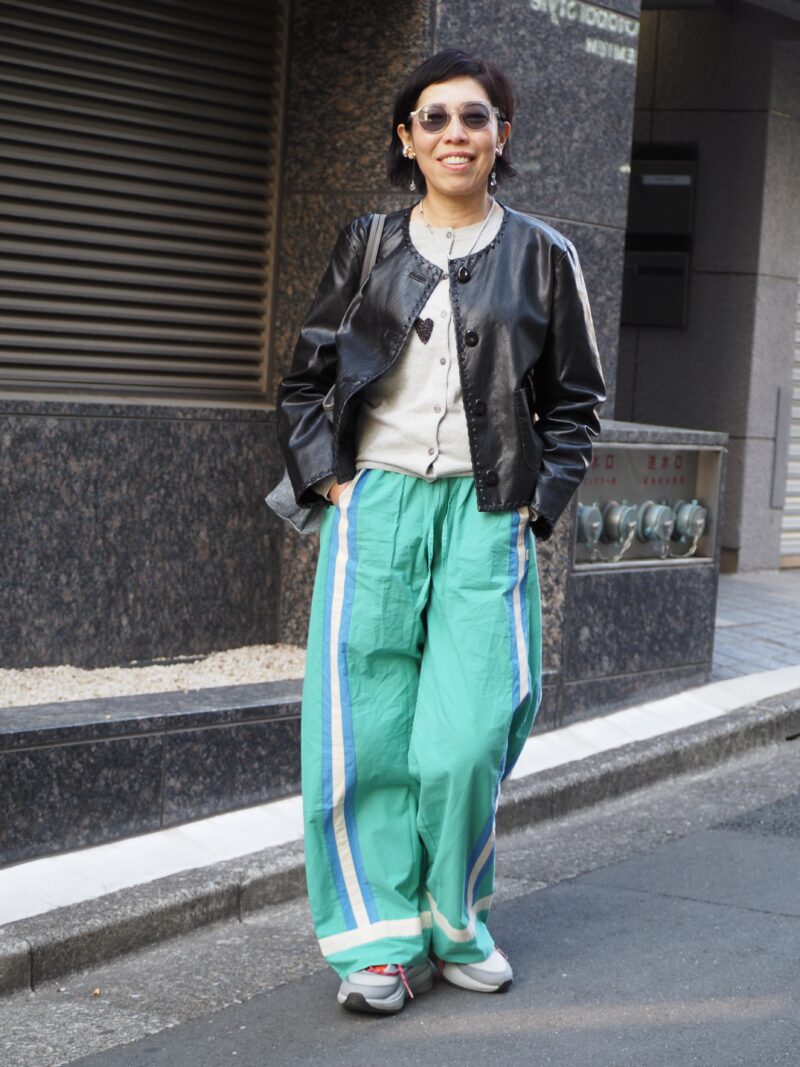 ライダースジャケットにナイロンパンツを合わせ、モード×スポーティのテイストミックスを楽しむ藤尾さん。上半身はタイトにまとめ、ワイドなボトムでメリハリをつけることでスタイルアップ効果も◎。