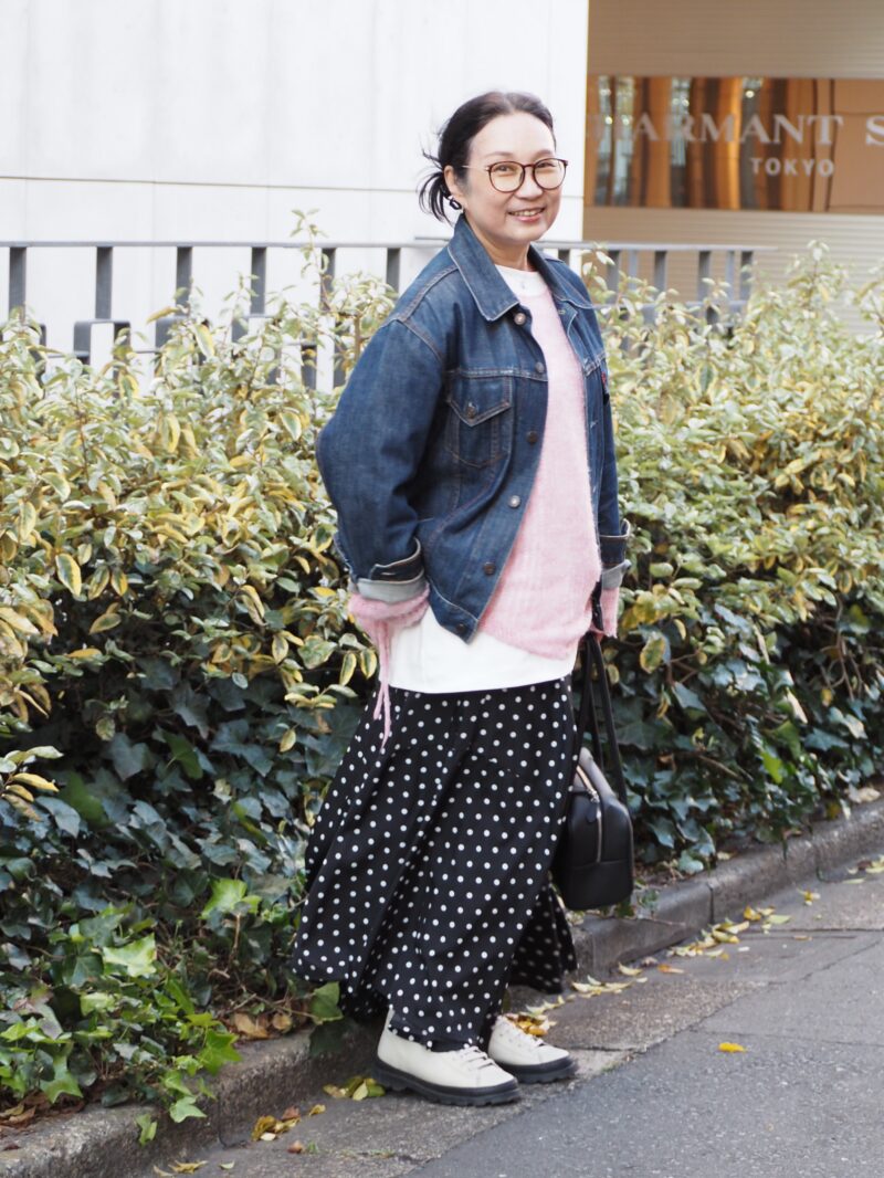 【スナップ】「デニムジャケット」を羽織るだけでOK! 甘くなりがちなピンク×ドットを大人仕様に