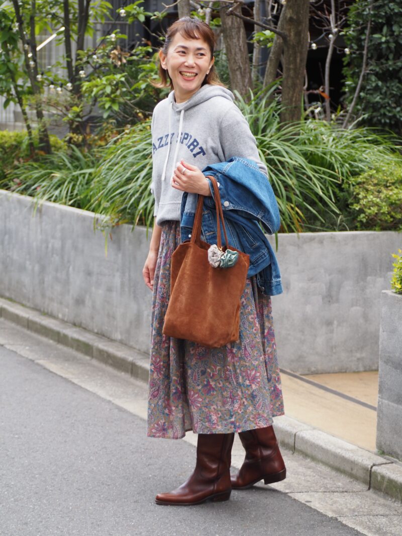 ラフな印象になりがちなパーカーに、スエードのトートバッグをオン。同系色の靴との濃淡をきかせることで、コーディネートに奥行きも生まれます。ハンドル部分につけたシュシュは「YURA」のもの。なんと、Ichihaさんの手作りなのだとか。