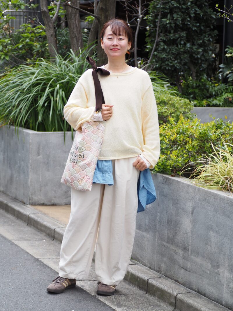 イエローのニットとナチュラルカラーのパンツが目に留まるリラックススタイル。春の陽気にマッチする配色がポイントです。「アディダス」の3本ラインもイエローで、さりげないカラーリンクも◎。腰にはデニムシャツを巻き付けて、動きのあるスタイリングに。