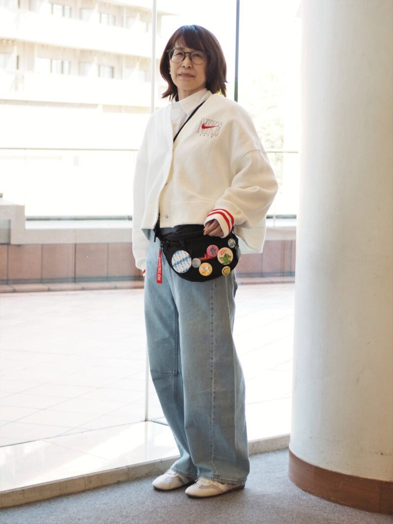 アクティブスタイルとの相性もバッチリなウエストポーチ。「旅先で購入したバッジで自分好みにアレンジするのがマイブームです。仕事を通じて仲良くなった若い世代の子たちと出かけた思い出がよみがえり、楽しい気持ちになります」