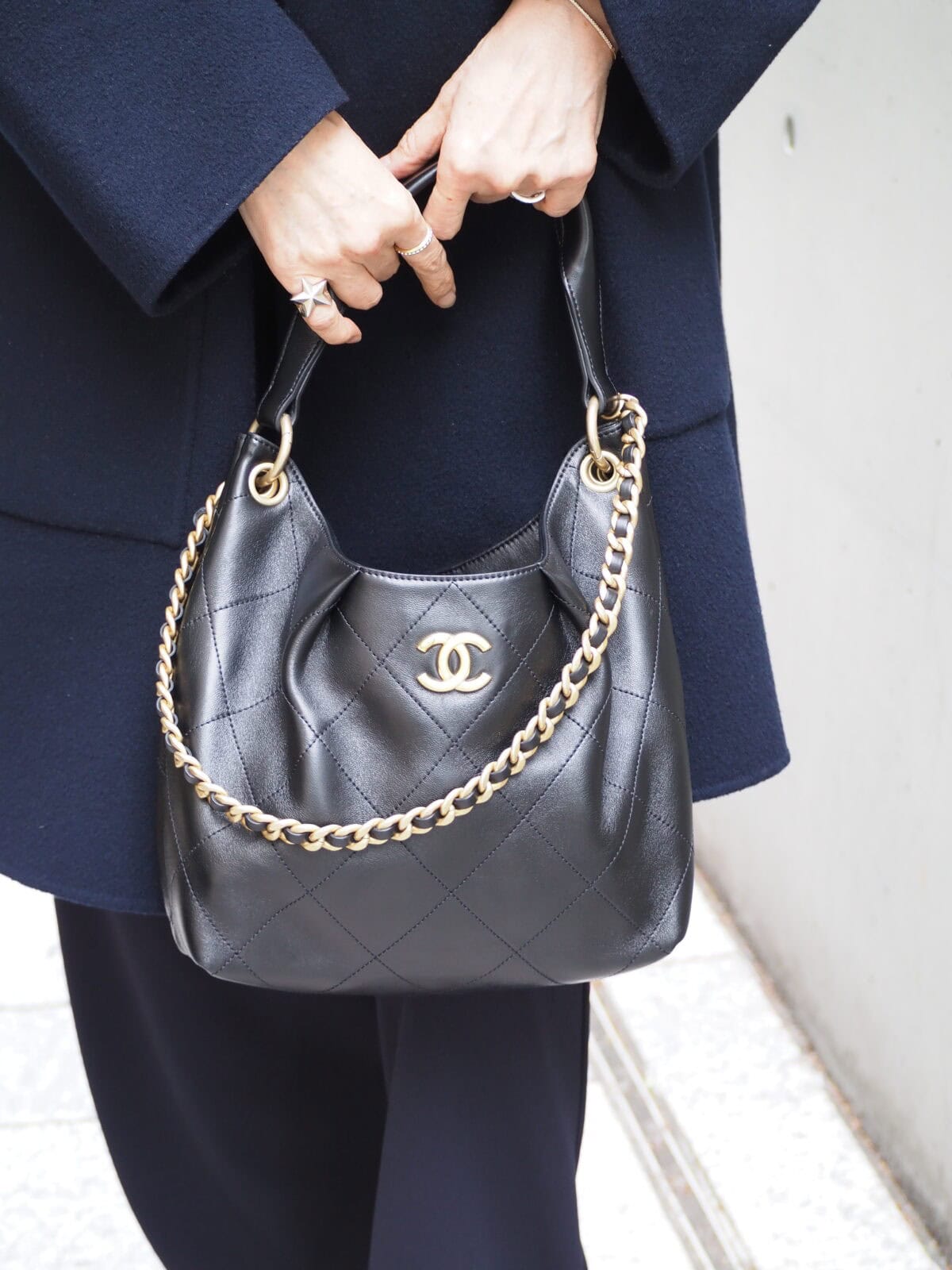 クラス感をもたらす「シャネル」のハンドバッグ。気取らないリラックススタイルに合わせて、装いを引き締めて。